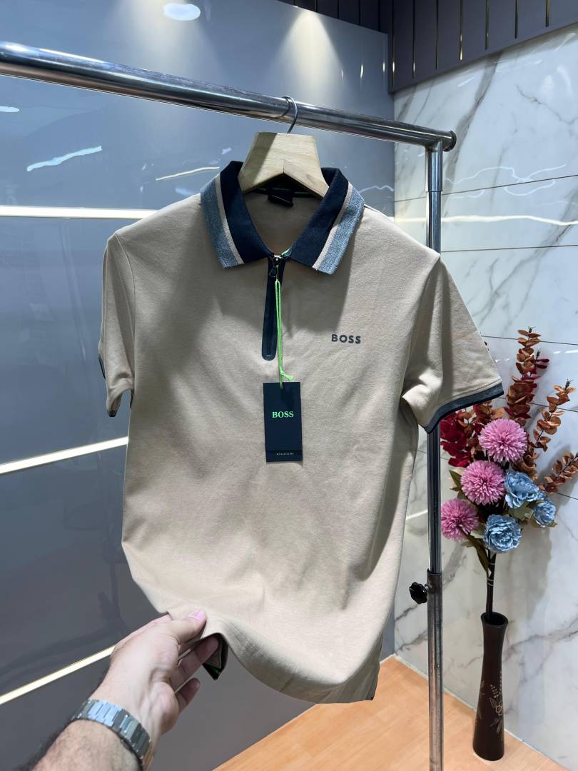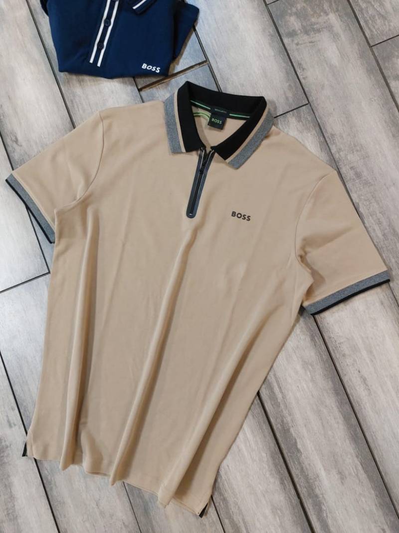 Hugo Bos s Beige Premium 240 gsm interlock cotton fabric Polo Tshirt with Collar Design and Emboss Logo Zip Style 3175